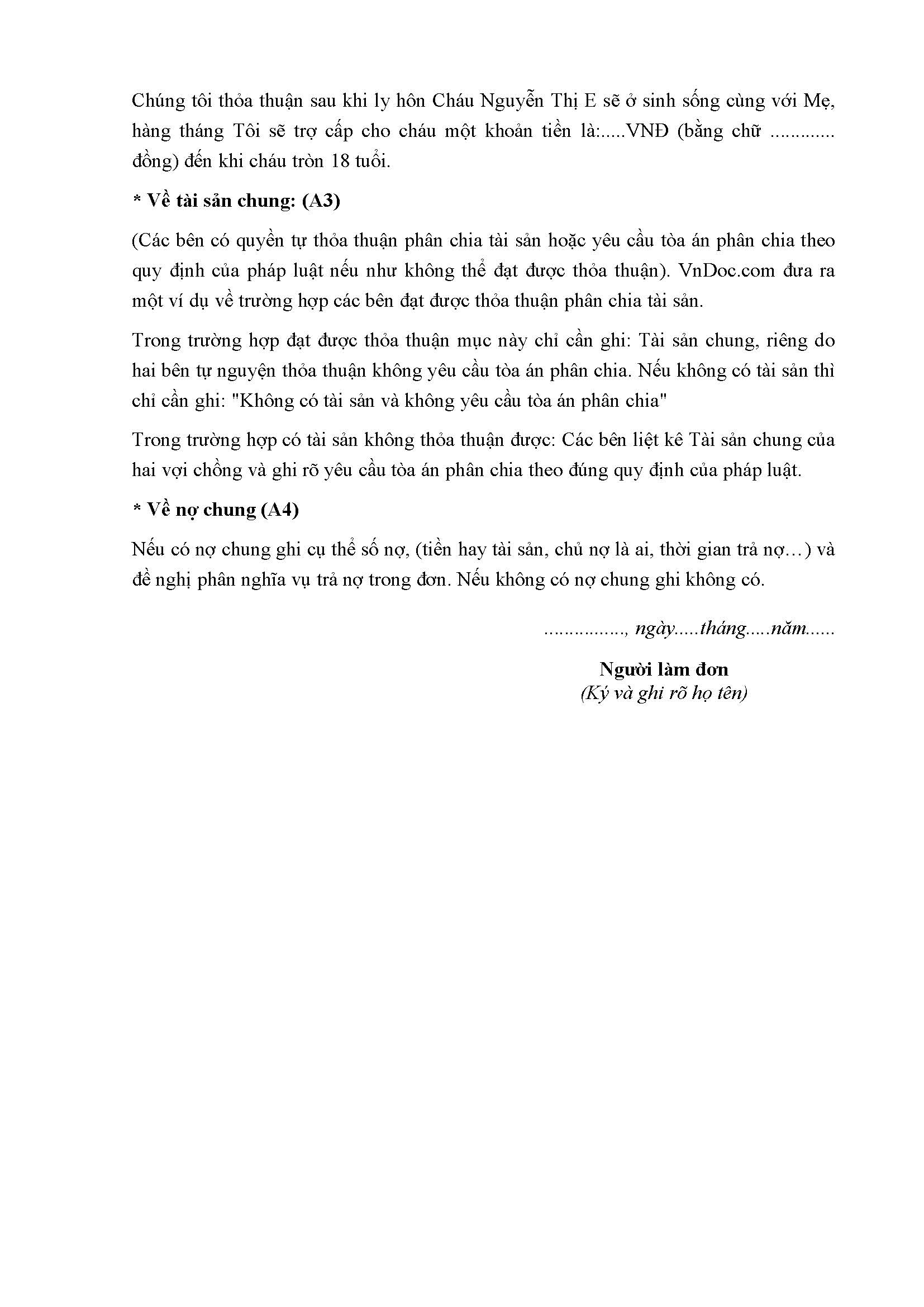 Chúng tôi thỏa thuận sau khi ly hôn Cháu Nguyễn Thị E sẽ ở sinh sống cùng với Mẹ, hàng tháng Tôi sẽ trợ cấp cho cháu một khoản tiền là:…..VNĐ (bằng chữ …………. đồng) đến khi cháu tròn 18 tuổi.