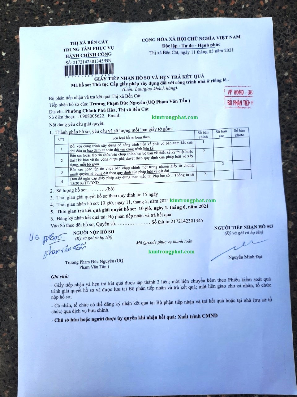 Và chúng ta sẽ có thành quả sau 45 ngày làm việc được Biên Nhận Hồ Sơ và Giấy phép xây dựng trong khu dân cư như sau: